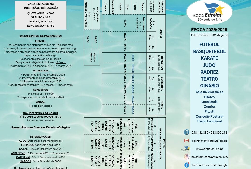 Basquetebol Futebol Grupo Teatro Adultos Judo Karaté Teatro Infatil Xadrez Preçário 2025/26 Futebol, Teatro, Judo, Karate, Basquetebol, Xadrez 1 de Julho, 2025 0 Comments 935 Views adminrestsasd asdas das estrelas-sjb.pt